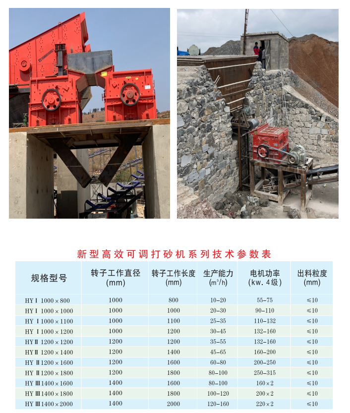 | 规格型号 | 转子工作直径(mm) | 转子工作长度(nm) | 生产能力(m3/h) | 电机功率(kw.4机) | 出料粒度(mm) |
